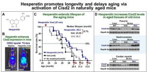 因此,透過增加CISD2長壽基因的表現量 (例如CISD2活化劑的給予),未來可能達到防止老化與延年益壽的效果。由蔡老師長壽基因研究團隊最新發表的論文證明,橙皮素 (Hesperetin)具有增加CISD2長壽基因表現量與延緩老化並促進健康長壽的功效。本研究為老化生物學及健康長壽之轉譯研究提供新的觀點,證實橙皮素主要是透過活化CISD2長壽基因表現,以達到抗衰老並促進健康長壽的功效。