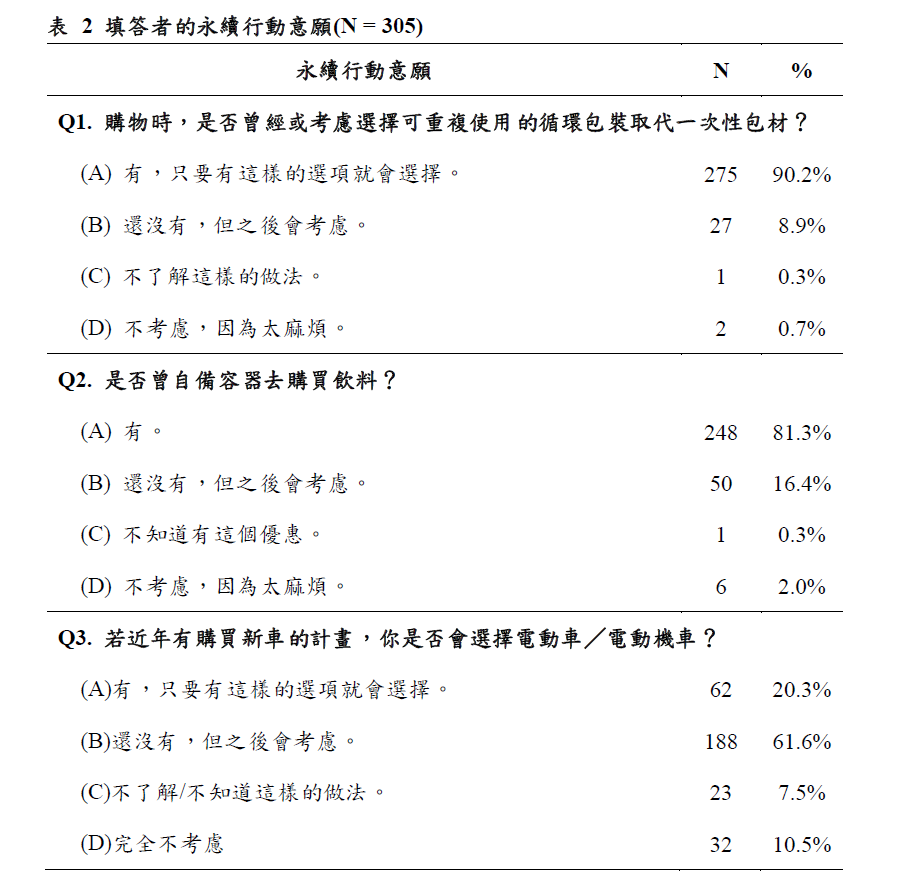除了瞭解大學生對於永續素養的認知與態度表現之外,如何在日常生活中實踐永續,也是一個值得重視的議題。