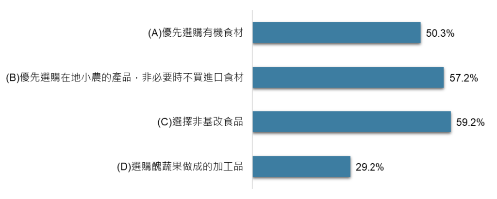 有超過一半的填答者表示會採取如「優先選購有機食材」(55.7%)、「優先選購在地小農的產品,非必要時不買進口食材」(72.8%)或「選擇非基改食品」(67.2%)等永續行動,