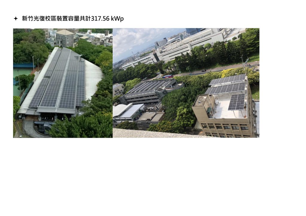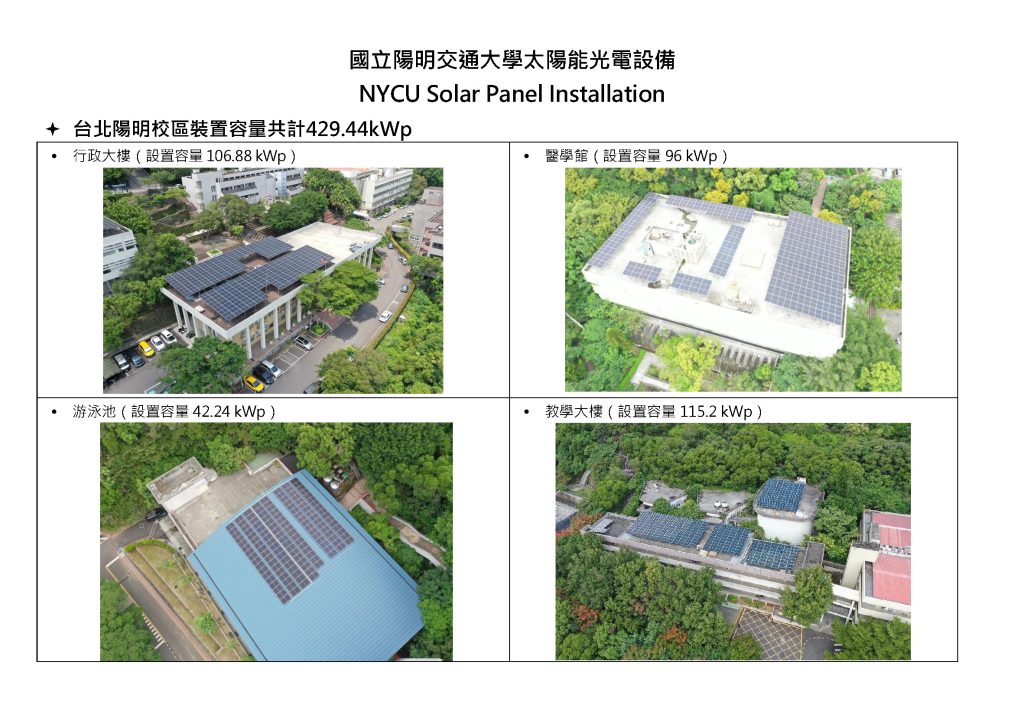 NYCU measures the amount of low-carbon energy used across its campuses through the iAUTO-Energy management system, which provides real-time monitoring and control of energy consumption at the building and device levels. The system enables accurate tracking of renewable energy generation and usage. In 2024, total solar photovoltaic power generation reached 8,337.06 GJ, supported by rooftop solar installations with a combined capacity of 1,941.14 kWp. These facilities help reduce the university’s carbon footprint and promote sustainable energy management practices.