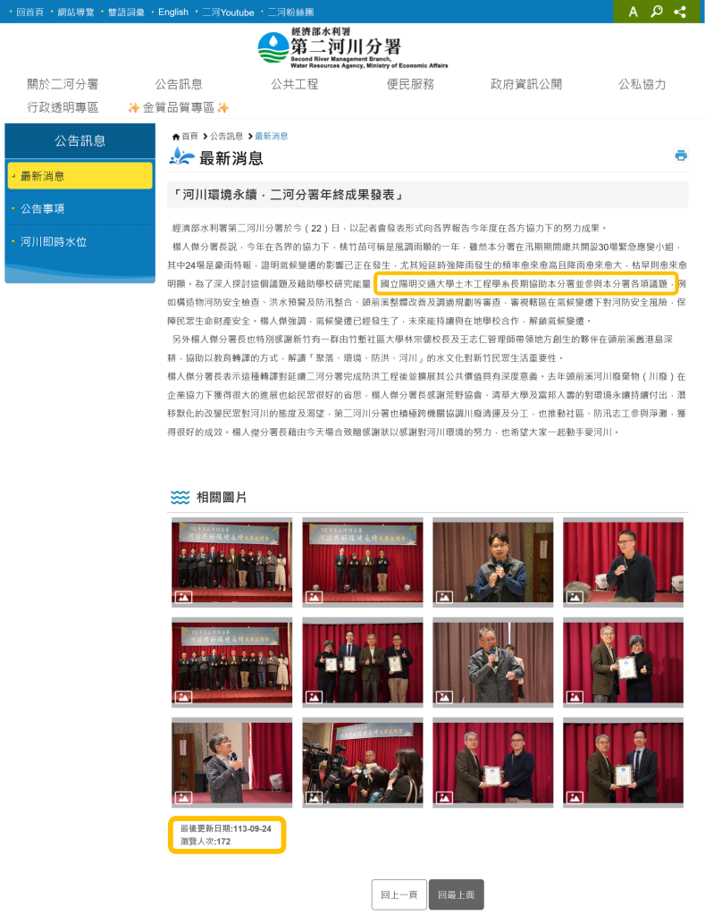 • With MEA – Supported flood early warning and integrated disaster prevention operations, reviewed national river warning levels, and joined the Taiwan–U.S. Water Resources Cooperation on global drought mitigation.