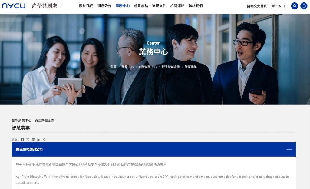 We nurture startups through incubation and accelerator programs, while connecting them to key resources. Supported by NYCU’s Industry–Academia Co-Creation Office, the spinoff startup AgriFront Biotech addresses food safety in aquaculture by leveraging a portable surface plasmon resonance testing platform and delivering innovative solutions for detecting veterinary drugs in aquatic animals.