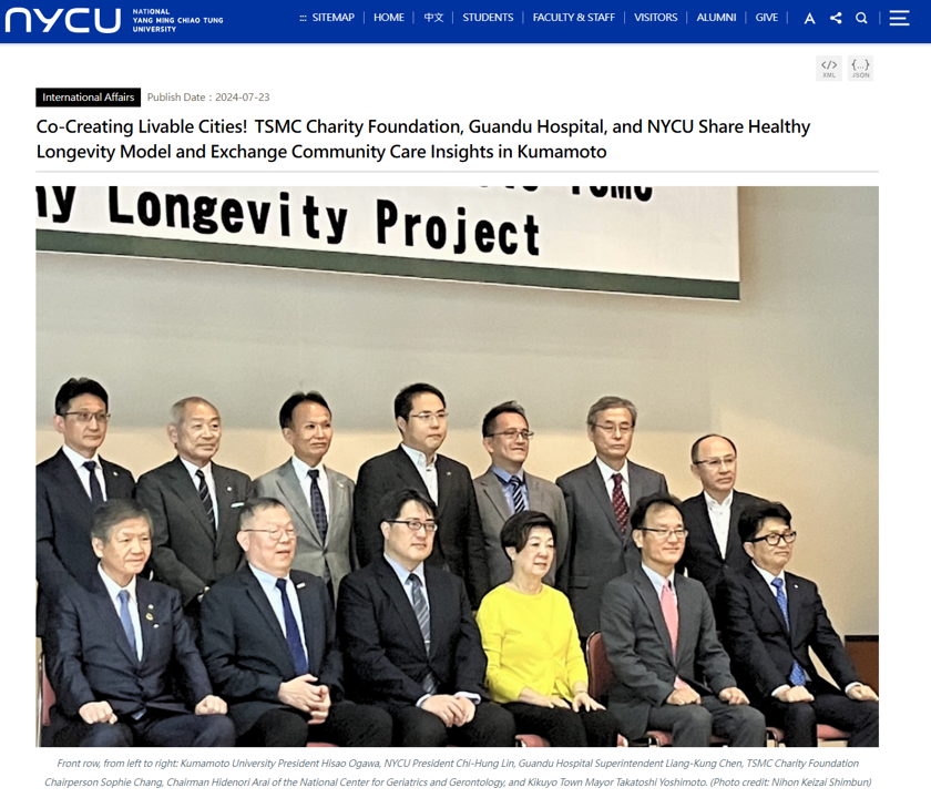■ Global: NYCU, with the TSMC Charity Foundation & Taipei Veterans General Hospital (TVGH), is exporting its “Healthy Longevity Smart Livable Community” model to Kikuyo, Japan. This Taiwan-Japan collaboration uses smart health management and livable design to promote healthy aging and address the challenge of extended unhealthy life spans, building a sustainable community for seniors.
