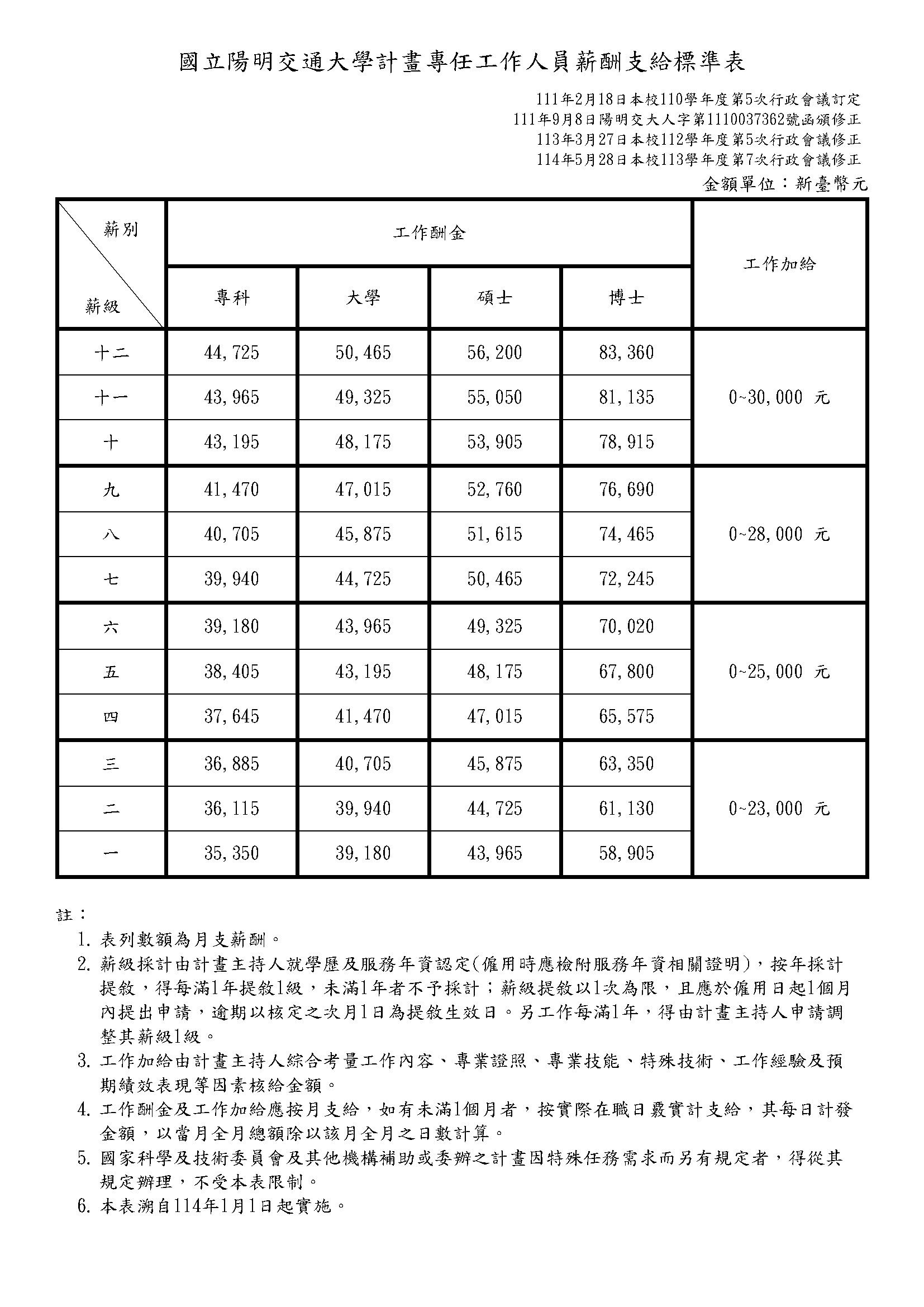 2.NYCU project full-time staff remuneration standard table (Announcements on Our Personnel Office website)