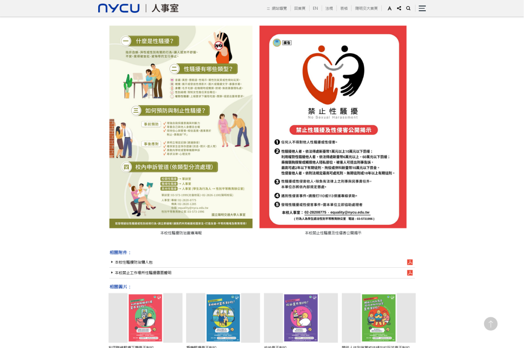 1. NYCU Workplace Sexual Harassment and Gender Discrimination Prevention & Handling Guidelines (Announcements on Our Personnel Office website) https://hr.nycu.edu.tw/userfiles/hrch/files/20250618110133759.pdf